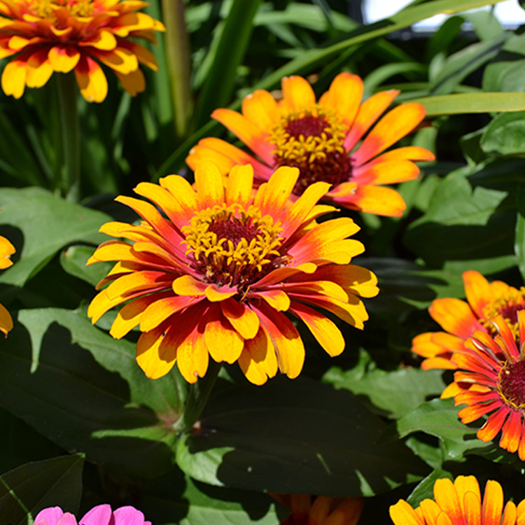 百日菊(學(xué)名:Zinnia elegans Jacq.):一年生草本。莖直立,高30-100厘米,被糙毛或長(cháng)硬毛。葉寬卵圓形或長(cháng)圓狀橢圓形,兩(liǎng)面(miàn)粗糙,下面(miàn)被密的短糙毛,基出三脈。頭狀花序單生枝端,總苞寬鍾狀;總苞片多層,寬卵形或卵狀橢圓形。舌狀花深紅色、玫瑰色、紫堇色或白色,舌片倒卵圓形,先端2-3齒裂或全緣,上面(miàn)被短毛,下面(miàn)被長(cháng)柔毛。管狀花黃色或橙色,先端裂片卵狀披針形,上面(miàn)被黃褐色密茸毛。雌花瘦果倒卵圓形,管狀花瘦果倒卵狀楔形。花期6-9月,果期7-10月。